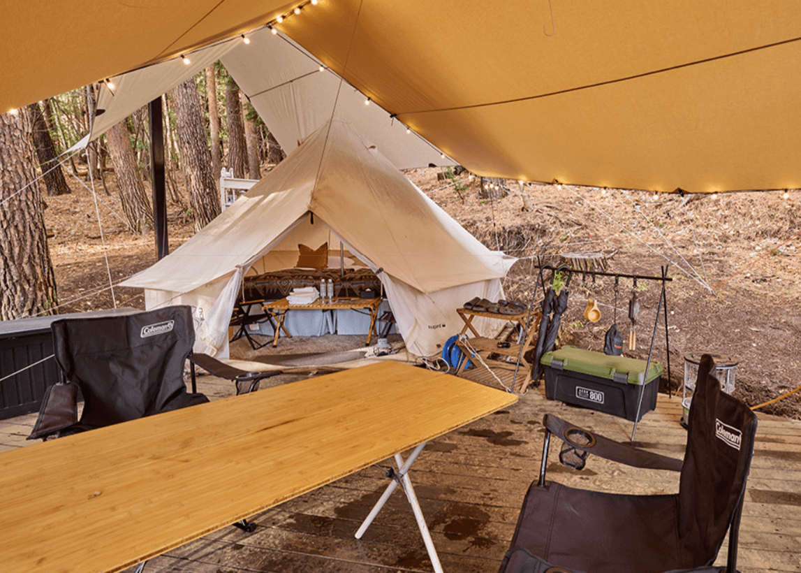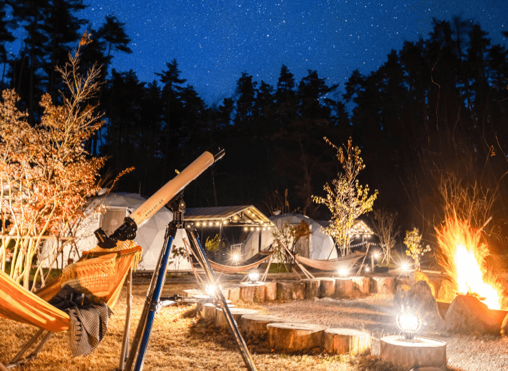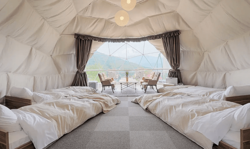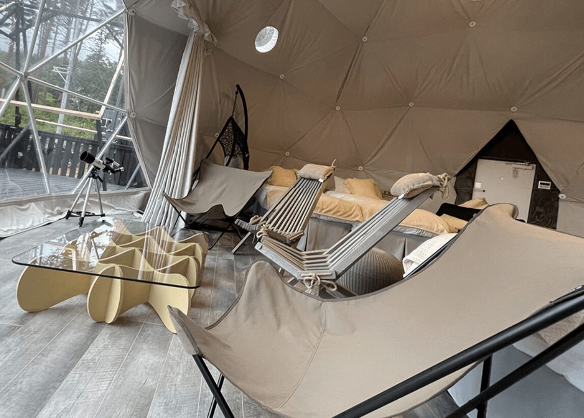 なかでもドーム型のテントが多く見られ、一部が透明な窓のようになっているテントもあり、外の景色や夜空、自然の雰囲気を楽しむことができます。外観はテントでありながら、内装はまるでホテルの部屋のように整えられているため、アウトドアの雰囲気とラグジュアリーさを同時に味わえるでしょう。
